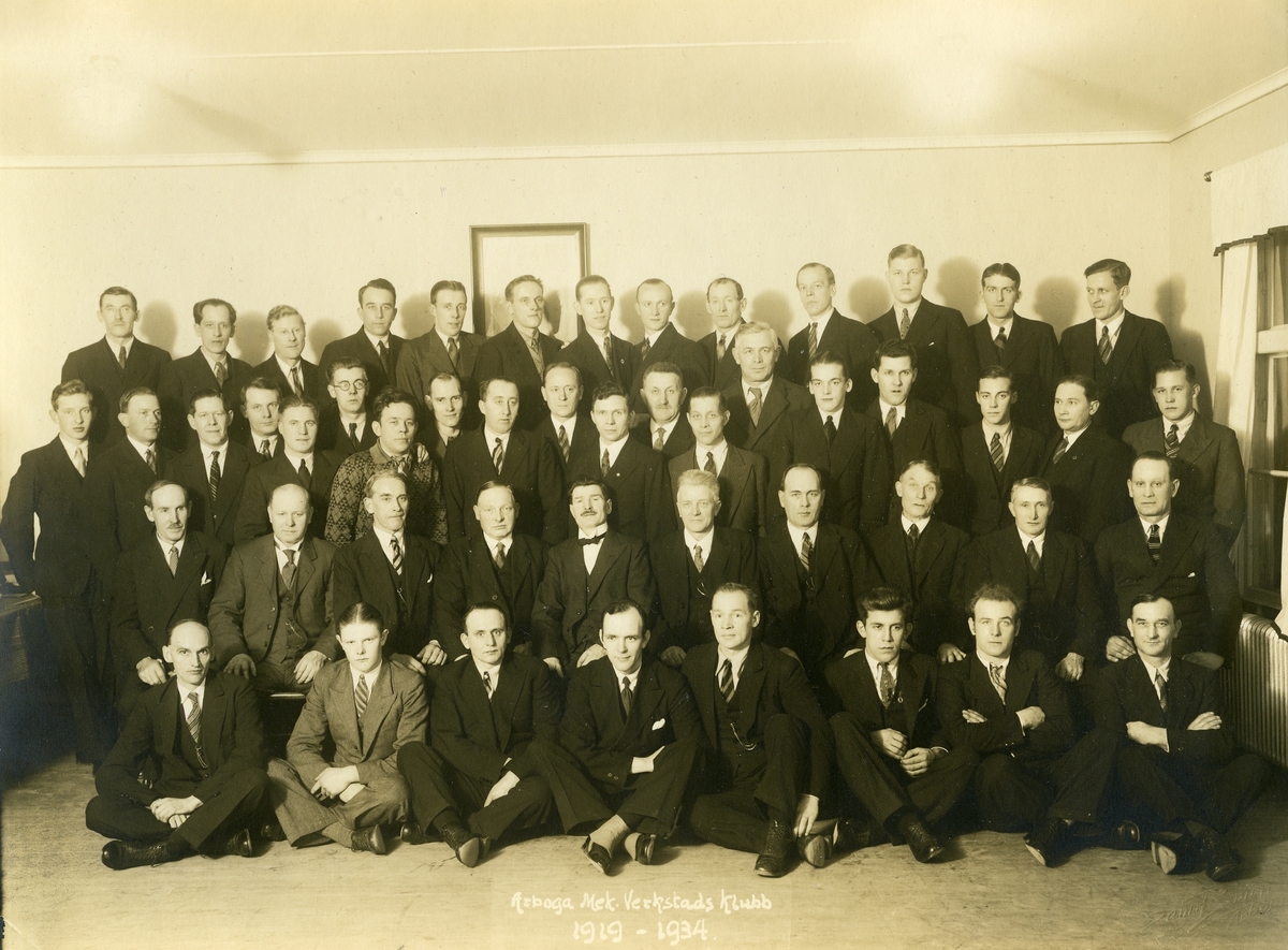 Gruppfoto av medlemmarna i Arboga Mekaniska Verkstadsklubb 1919-1934