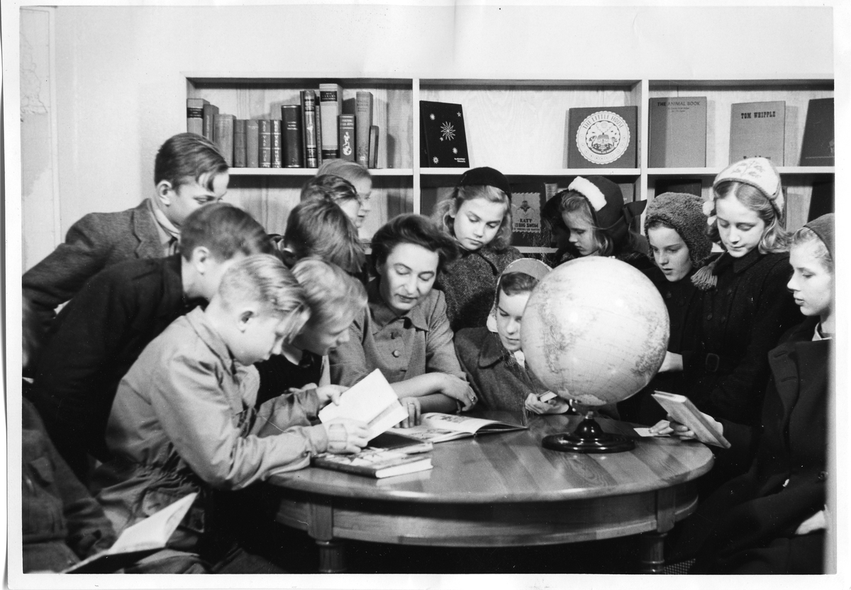 En jordglob står på bordet. Bakom barnen står flera bokhyllor mot väggen. Det är böcker på hyllorna.