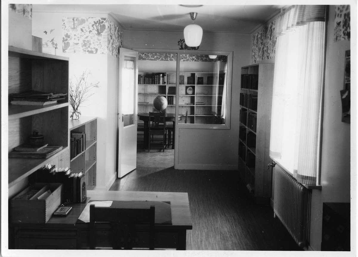 Biblioteksinteriör med bokhyllor, böcker, ett skrivbord, en glasdörr och en jordglob.