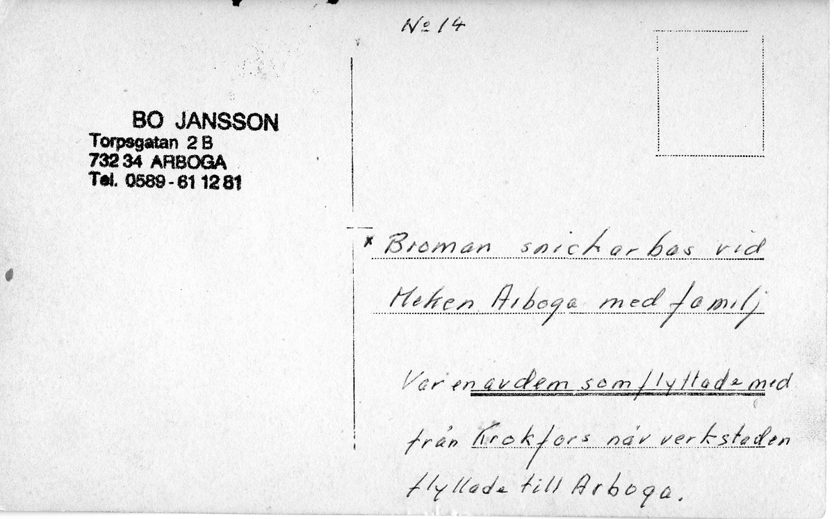 Baksidan till fotografiet av familjen Broman, med anknytning till Arboga Mekaniska Verkstad.