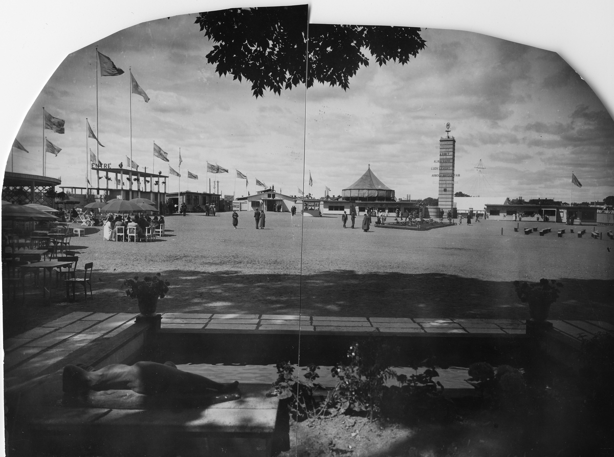 Entrén till Arbogautställningen. Människor strövar på området. Några personer sitter vid ett serveringsbord. Flaggorna är hissade.