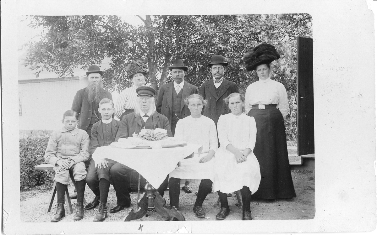 Två kvinnor i stora hattar, fyra män med hattar, skägg eller mustasch, två flickor och två pojkar. Bilden är tagen utomhus. Ett pelarbord står framför de som sitter.