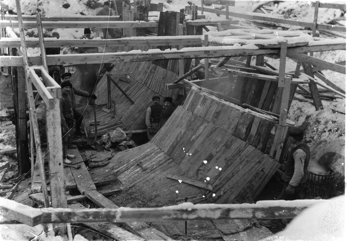 Grindberga kraftstation under byggnad. Flera män i arbete. Det är vinter och snö.