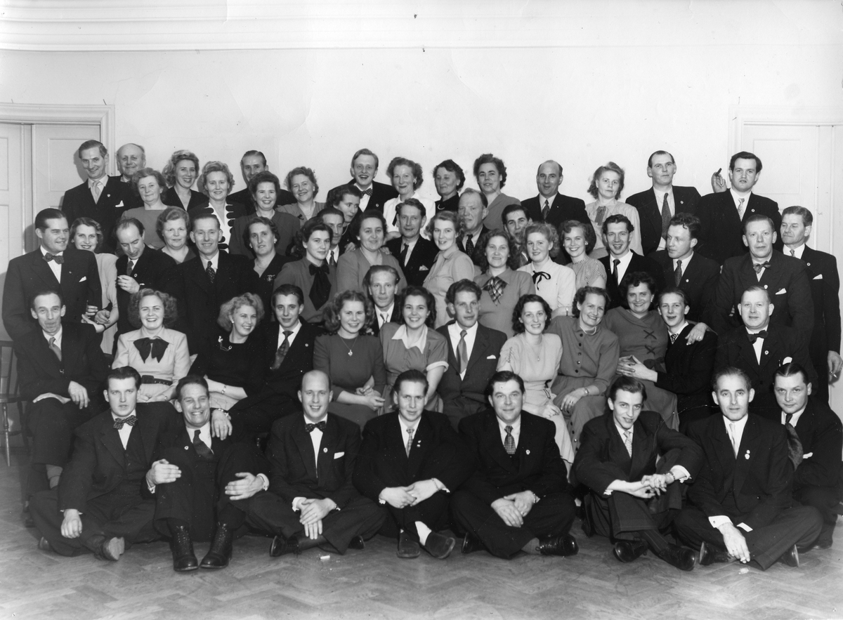 Gruppbild med kvinnor och män. Människorna är uppklädda. Bilden är tagen inomhus. Någon röker.