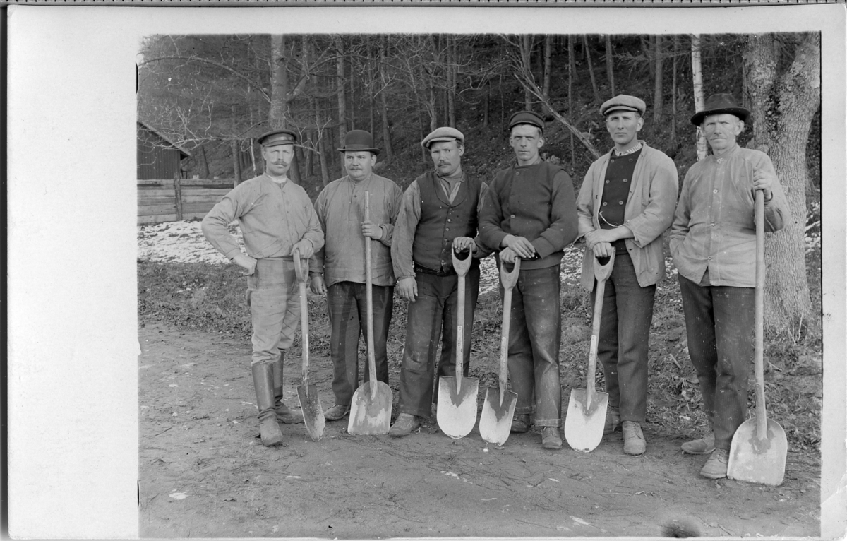 Sex män med spadar och skyfflar. Alla bär hatt eller annan huvudbonad.