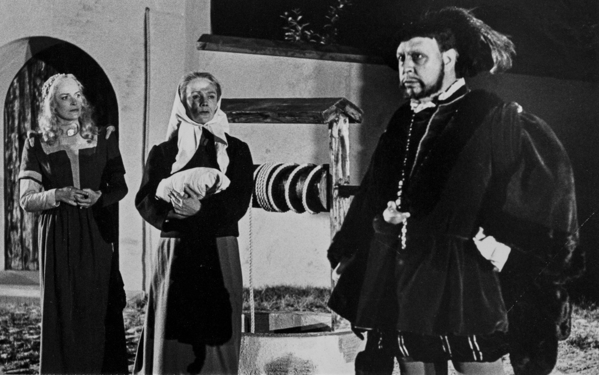 Rune Lindström i rollen som Engelbrekt Gertsson i föreställningen Giv oss fred. Kvinnorna är inte identifierade.
