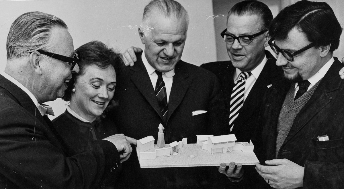 Det närmar sig premiär för Giv oss fred. Samlade runt en modell av skådeplatsen, från vänster: Rune Lindström (författare och regissör), Astrid Söderbaum (den första som spelat Malena Rödkåpa), Holger Eklöv (Arboga Lions), Sten Wahlgren (Arboga Lions) och Thorolf Engström (scenograf).