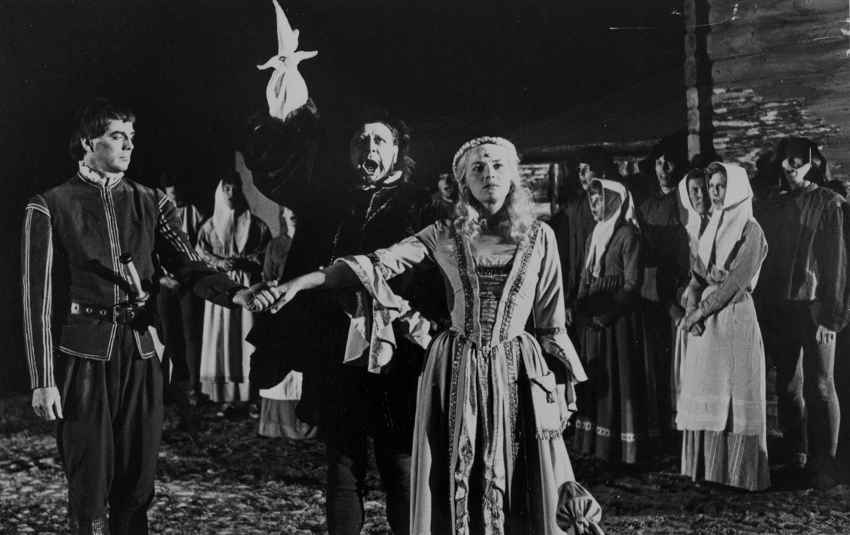 En scen ur Giv oss fred. Rune Lindström, mitt i bild, gestaltar Engelbrekt Gertsson. En man håller en kvinnas hand. I bakgrunden står befolkningen och ser på.