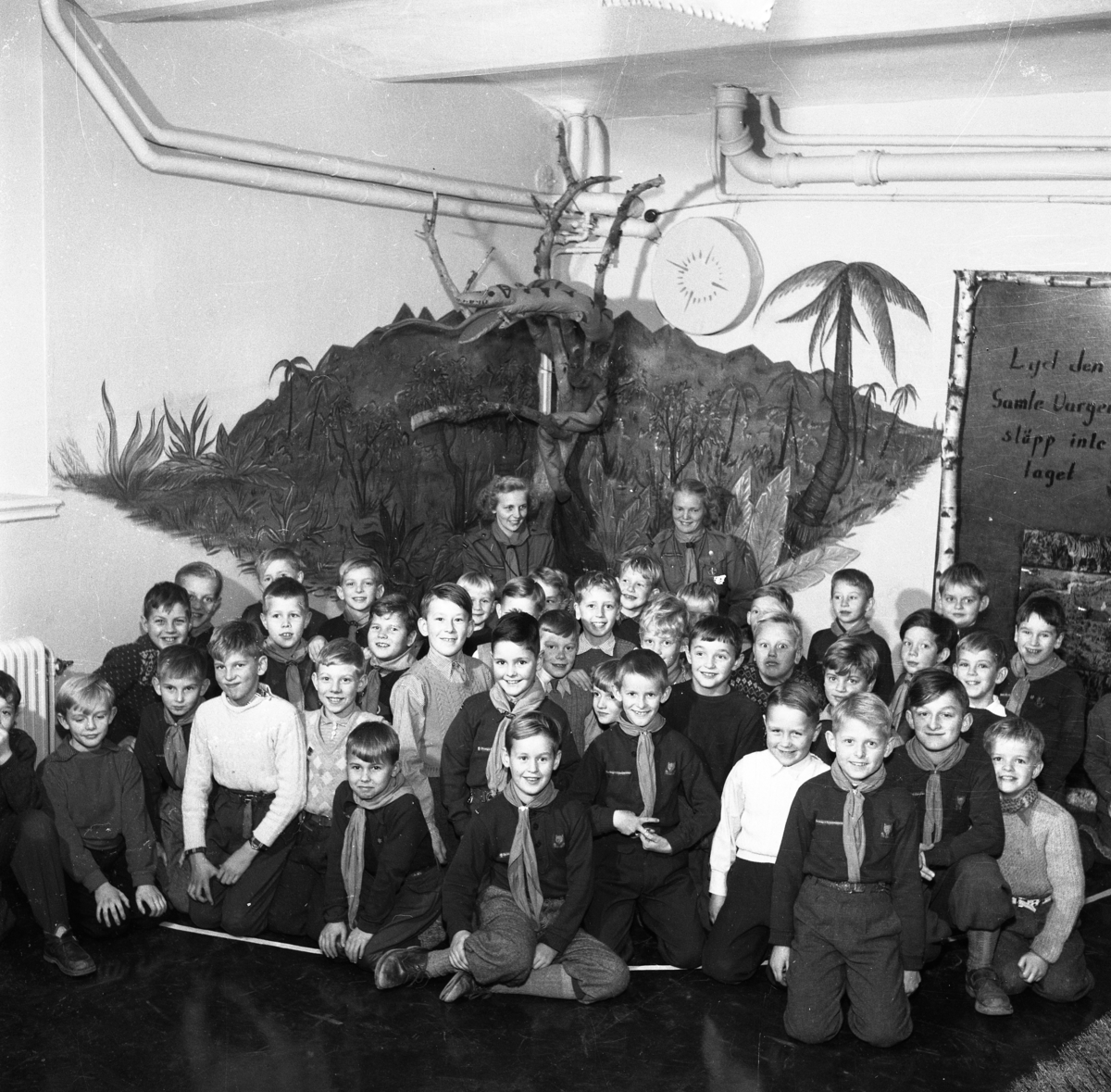 Scouternas Vargungar samlade för gruppfotografering. Två unga kvinnor står längst bak. Pojkarna har sjal om halsen.