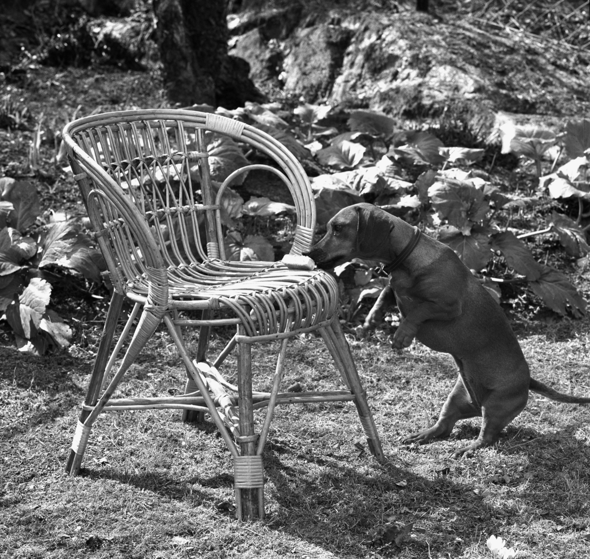 Titel: Utemöbler Korgstol med hund i grönskande trädgård