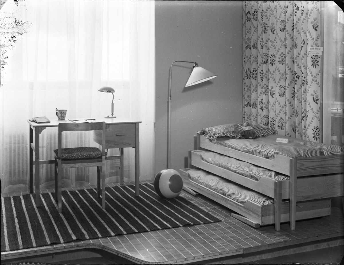 Sovrum för barn med tre säng (varav två utdragssängar) skrivbord, stol, lampa, matta och boll