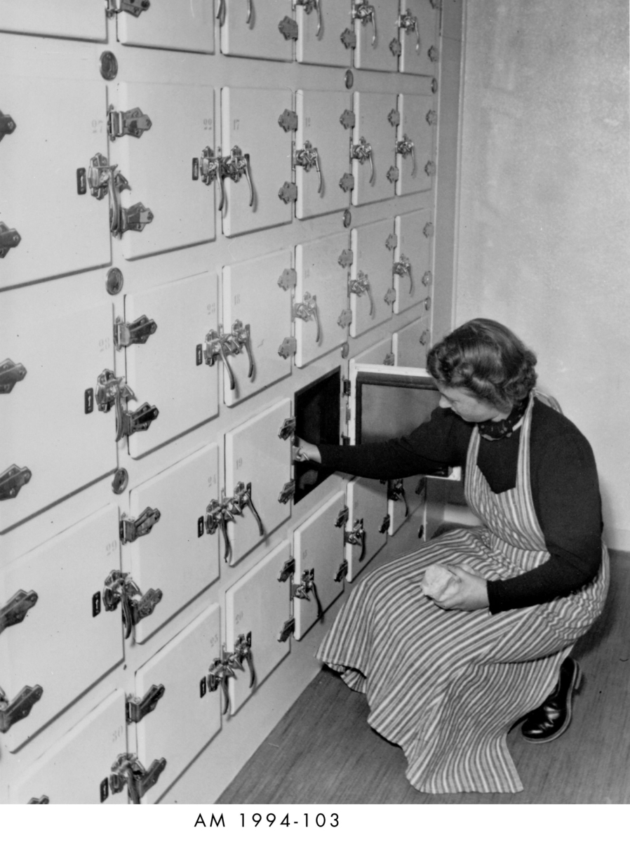 Interiör med hukande kvinna vid fack.