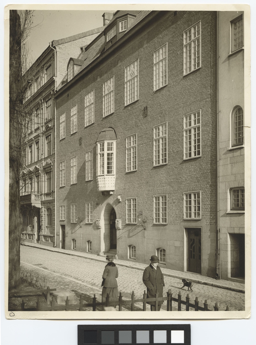 Exteriör av Svenska Läkaresällskapets hus. En kvinna med hund och man i förgrunden.