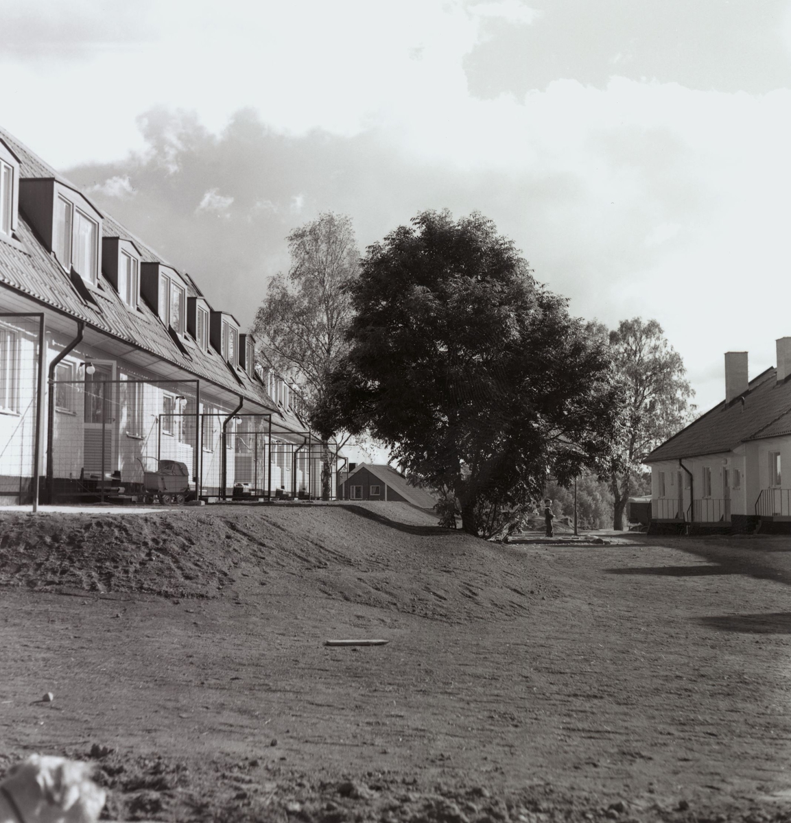 Exteriör, radhusområde, fasader vettande mot öppet fält.