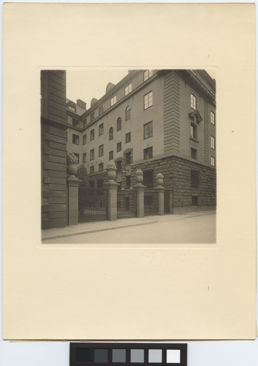 Exteriör dagtid. Byggnadens baksida samt gavel. Järnstaket med urnor mot gatan.