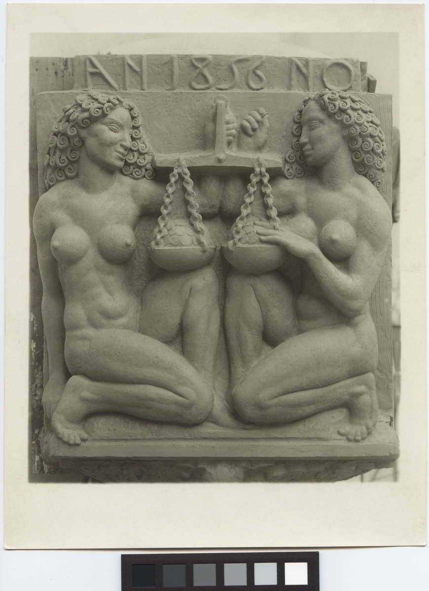 Exteriör, skulpturgrupp av Carl Milles utmed fasadliv.