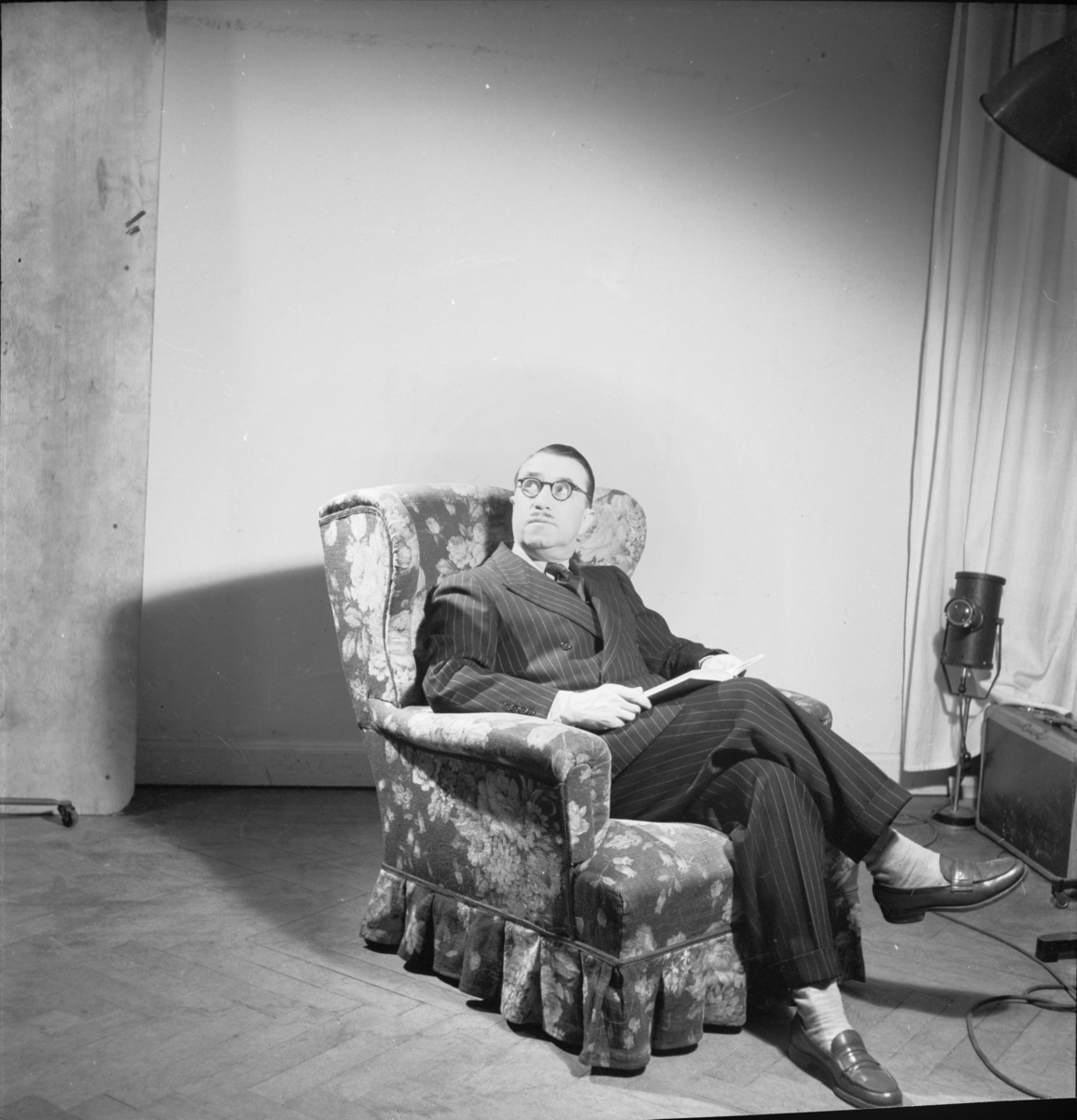 Man i kostym sittande i fåtölj