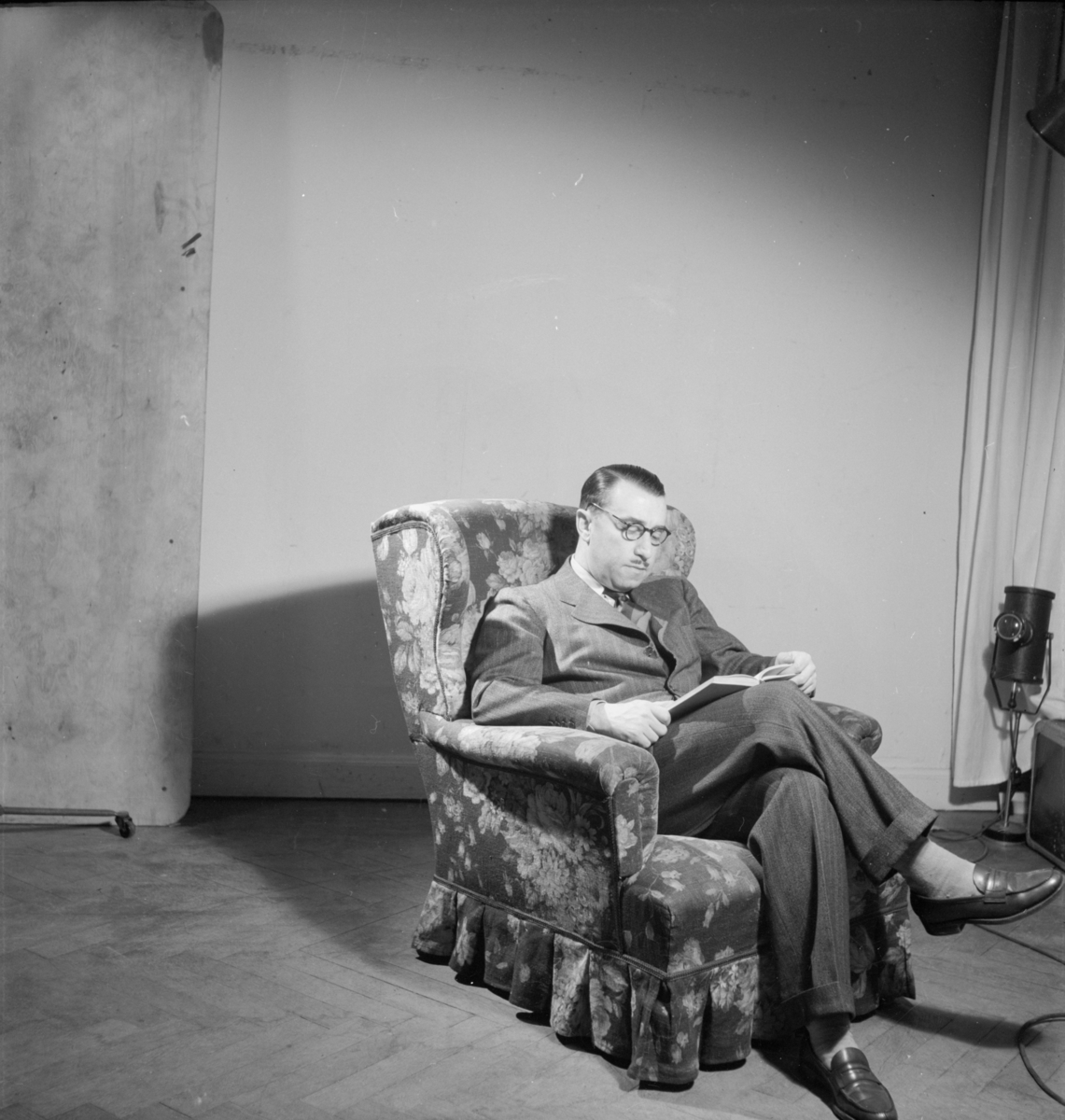 Man i kostym sittande i fåtölj