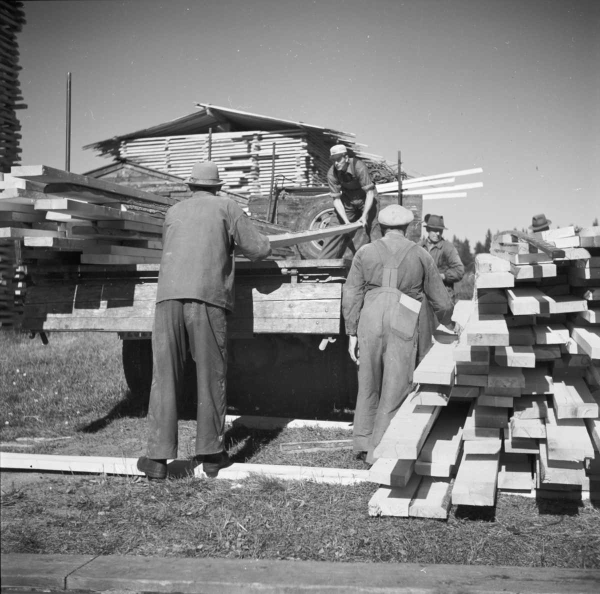 Titel: Öster Ledinge sågverk Personal lastar plank Exteriör