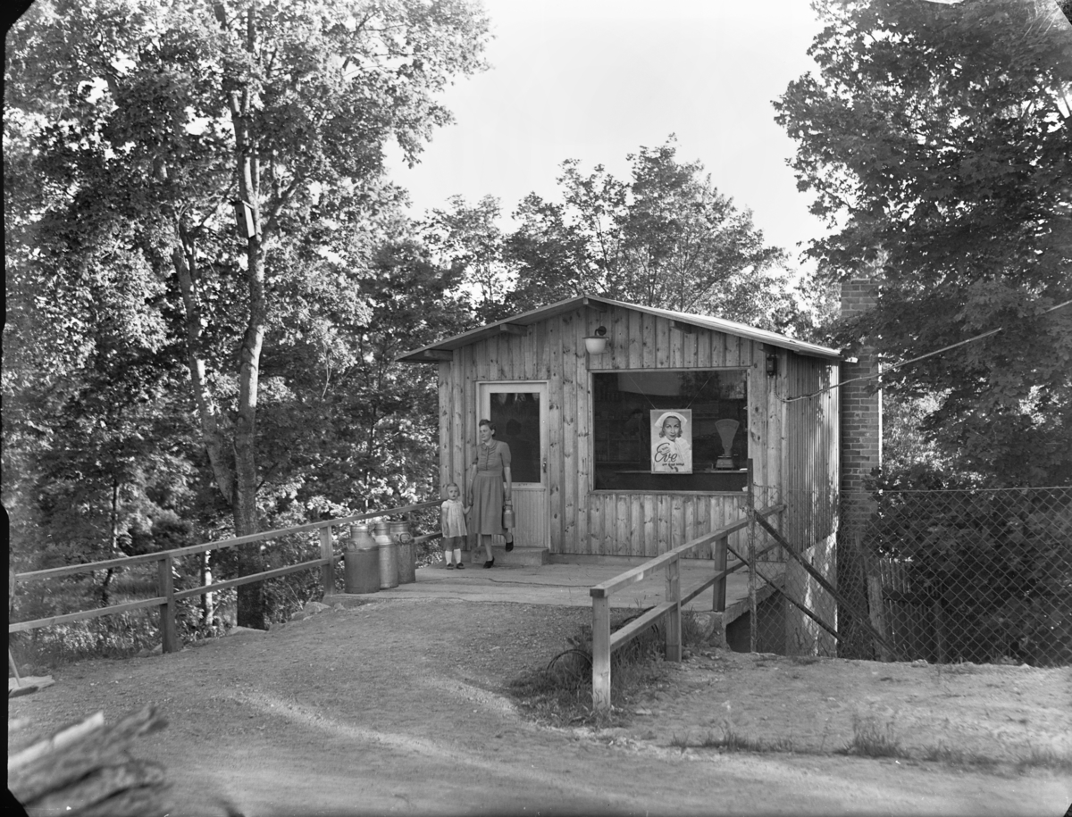 Omålat trähus och en kvinna med mjölkflaska