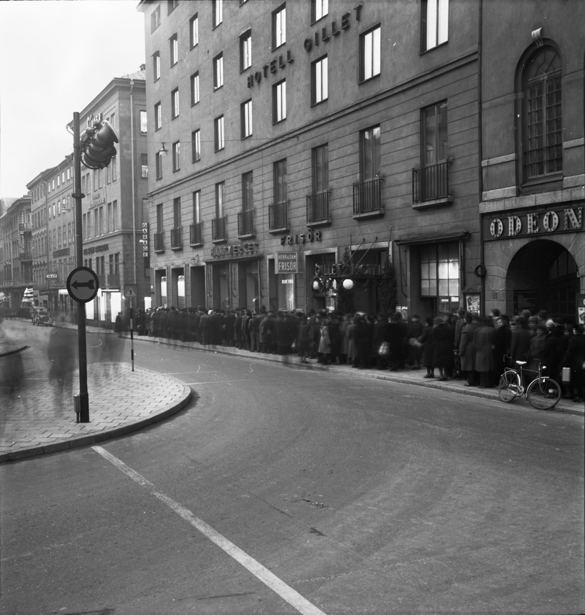 Kö vid Hantverkslotteriet på Vattugatan upp mot Brunkebergstorg.