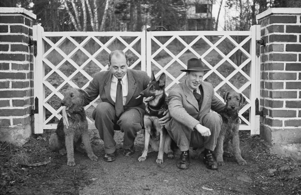 Titel: Villa Ulfhaga med familjen Sandström, Velamsund Två män med hundar famför grindarna