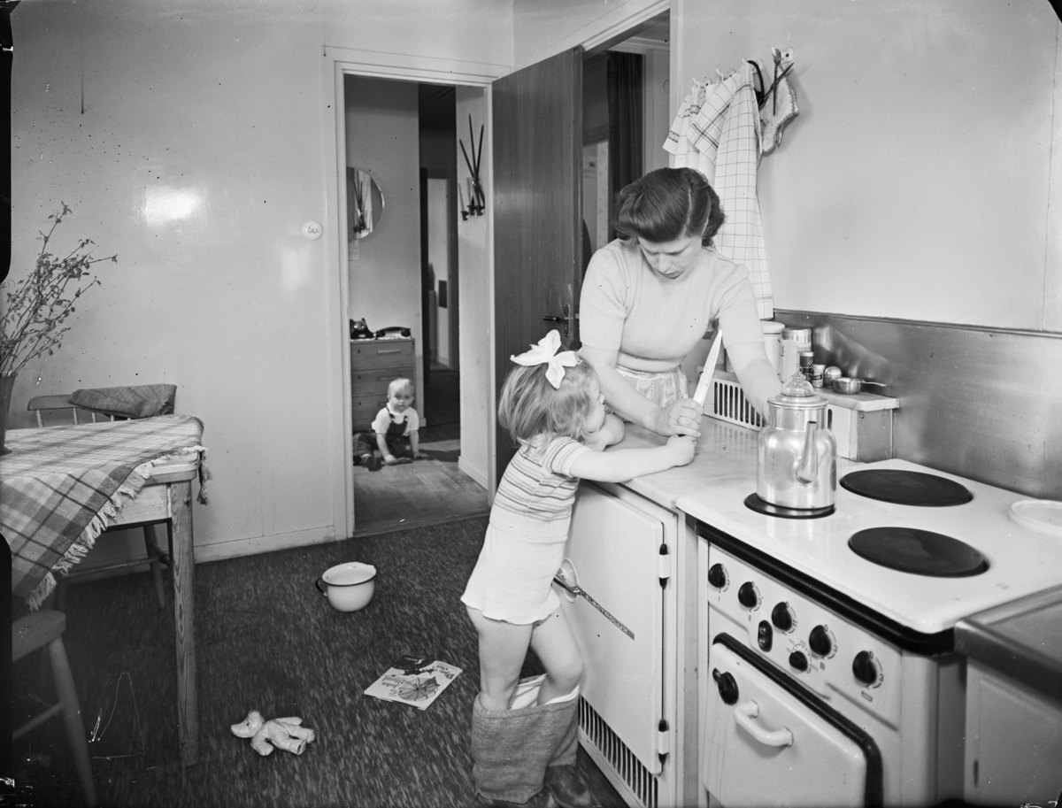 Titel: Reportage från Hemmens forskningsinstitut för tidningen Vi Bildserie med en mamma och två barn kring faror i hemmet Kök Interiör