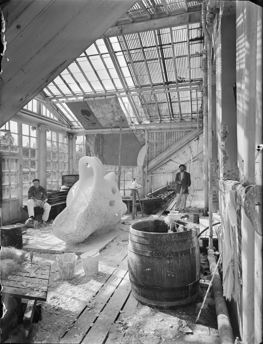 Titel: Konstnären Egon Møller-Nielsen och medarbetare under arbetet med lekskulpturen Tuffsen