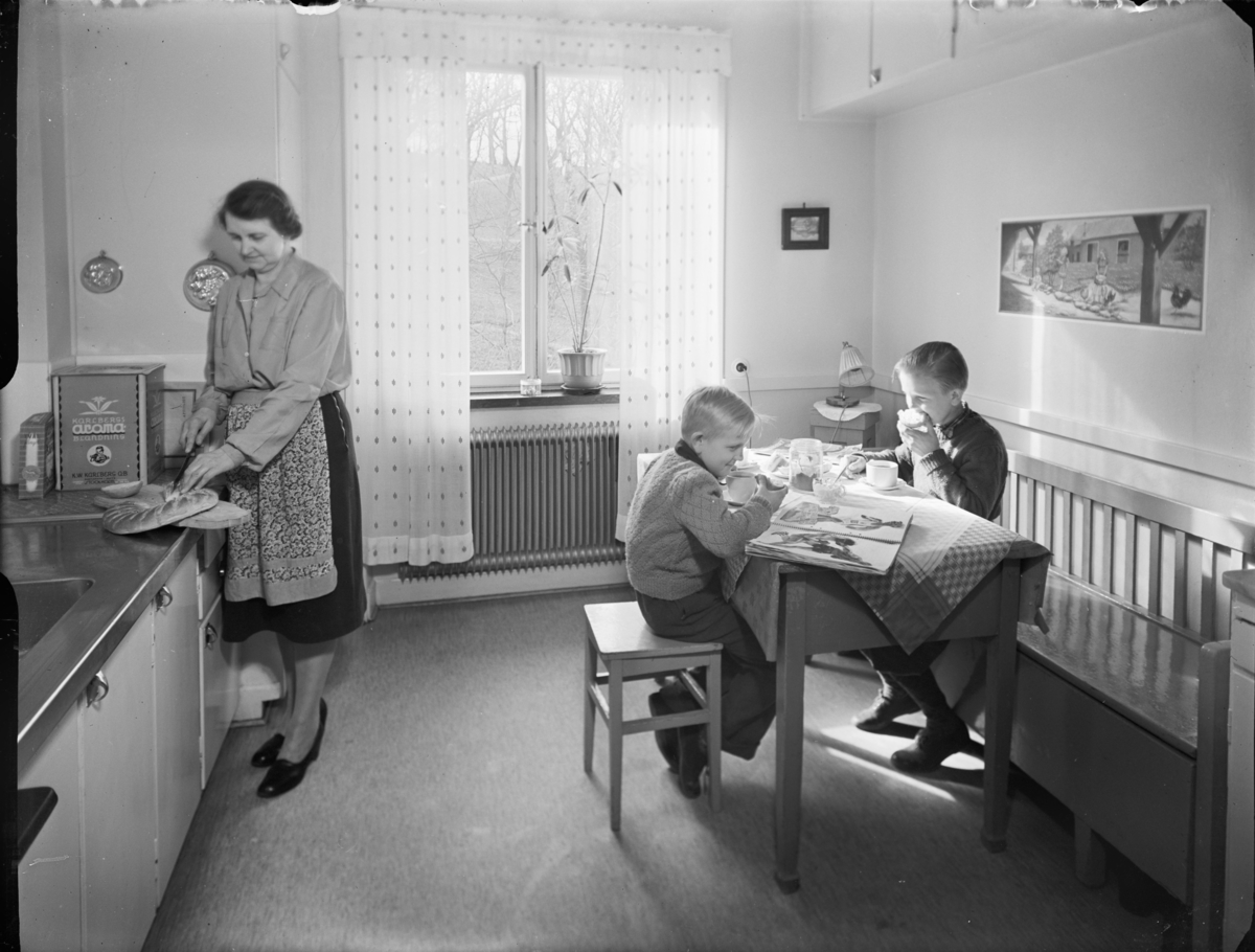 Kök med en kvinna och två barn som äter mellanmål