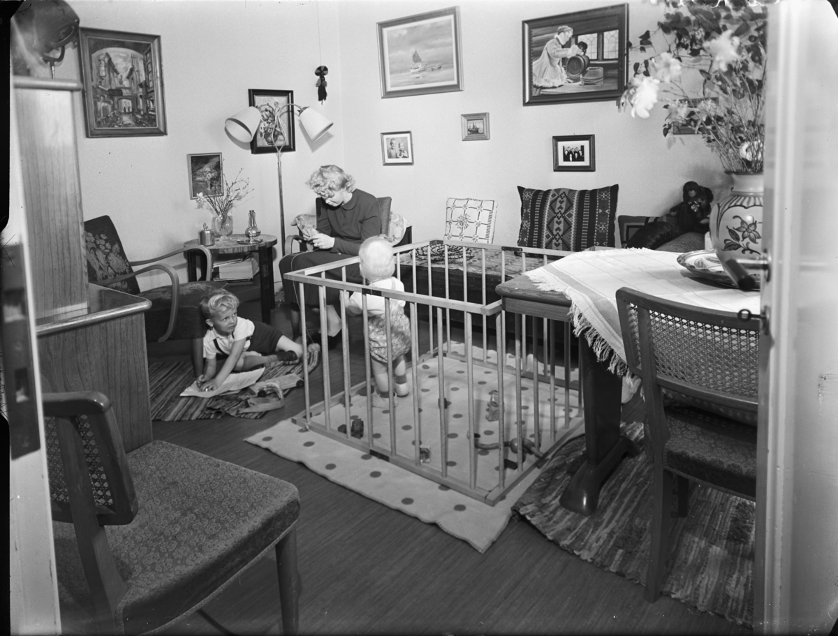 Trångt vardagsrum med en kvinna, två barn och en barnhage
