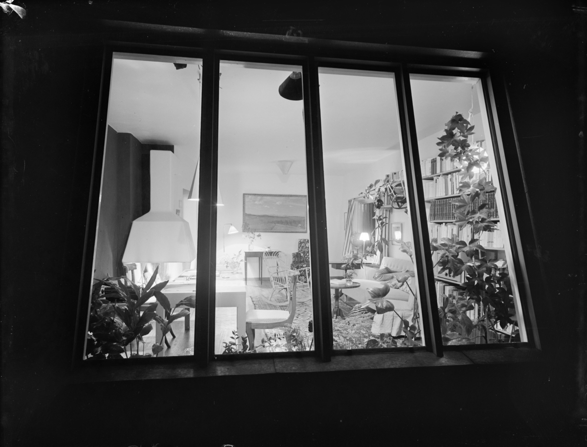 Vardagsrum med snedställt fönsterparti och öppen spis