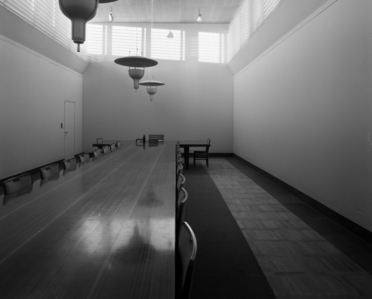 Interiör av sammanträdesrum, ljusinsläpp från fönster vid innertaket