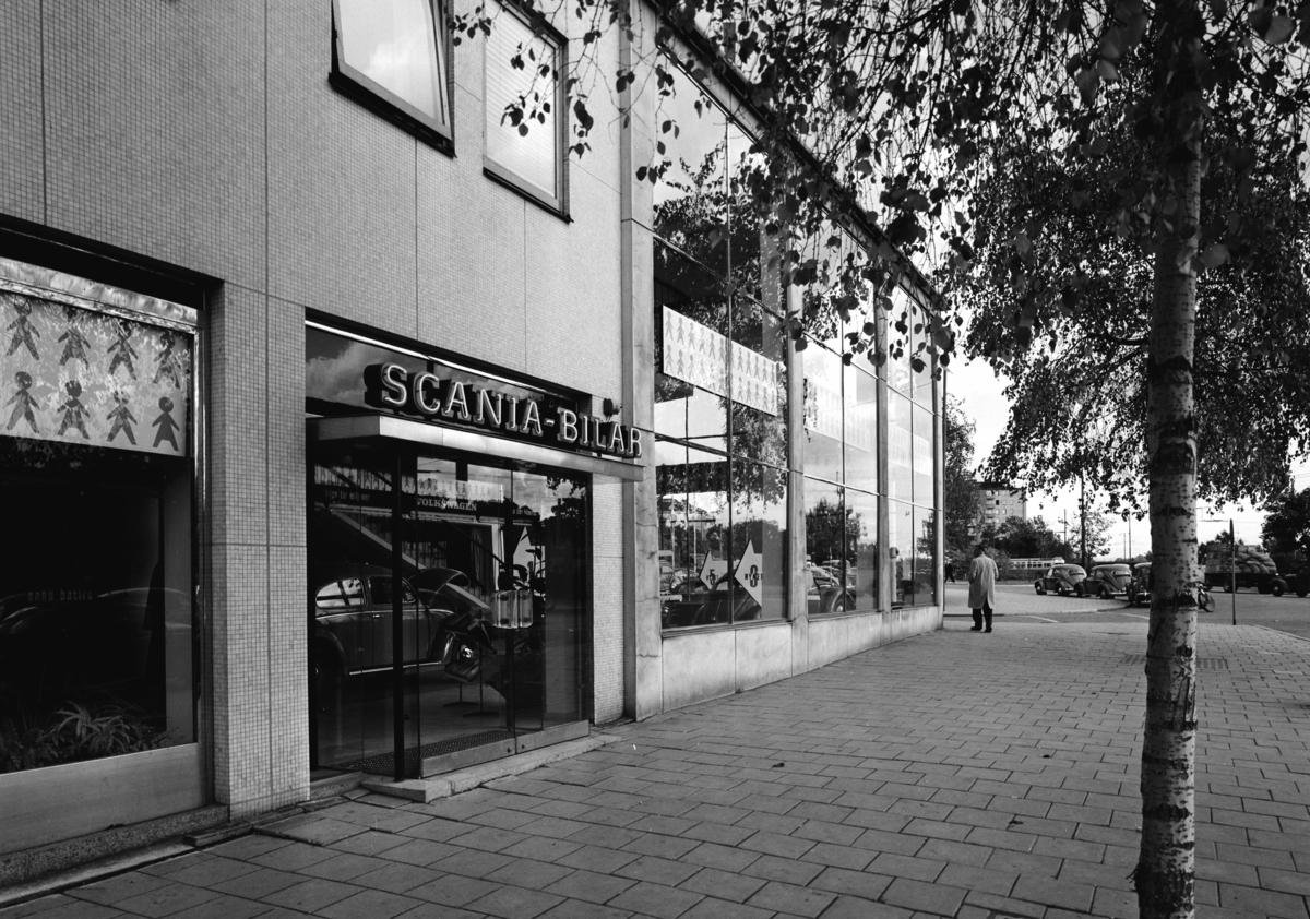 Exteriör, bilsalong för Scania bilar med skyltfönster i markplan.