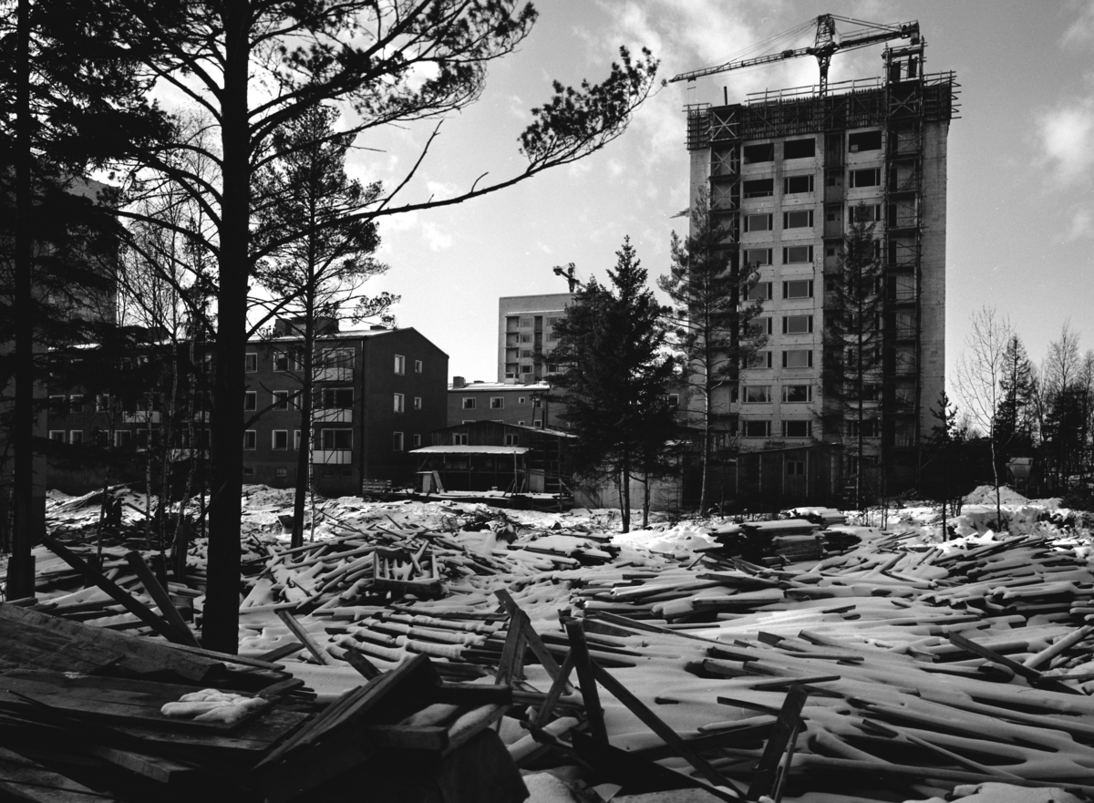 Exteriör, höghus och blivande centrum i Högdalen, snötäckt fält i förgrunden.