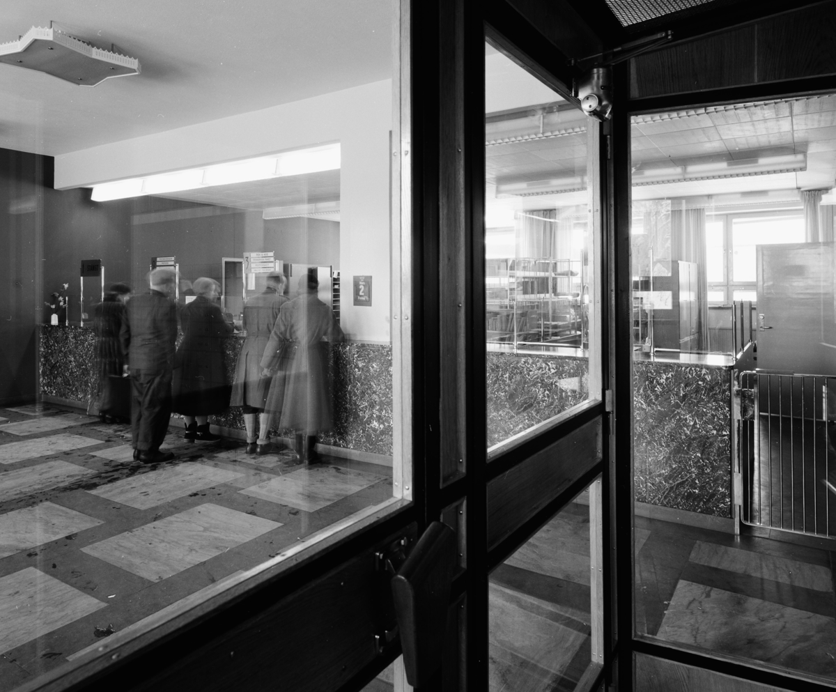 Interiör, människor som köar vid servicedisk med glasluckor. Glasad entré i förgrunden