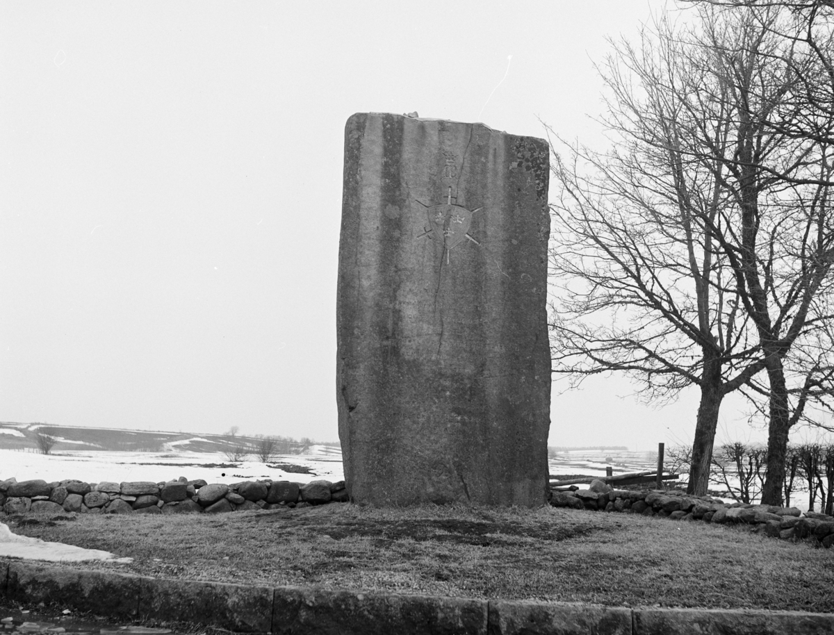 Exteriör, minnesmärke i form av stor sten, med inristat riksvapen