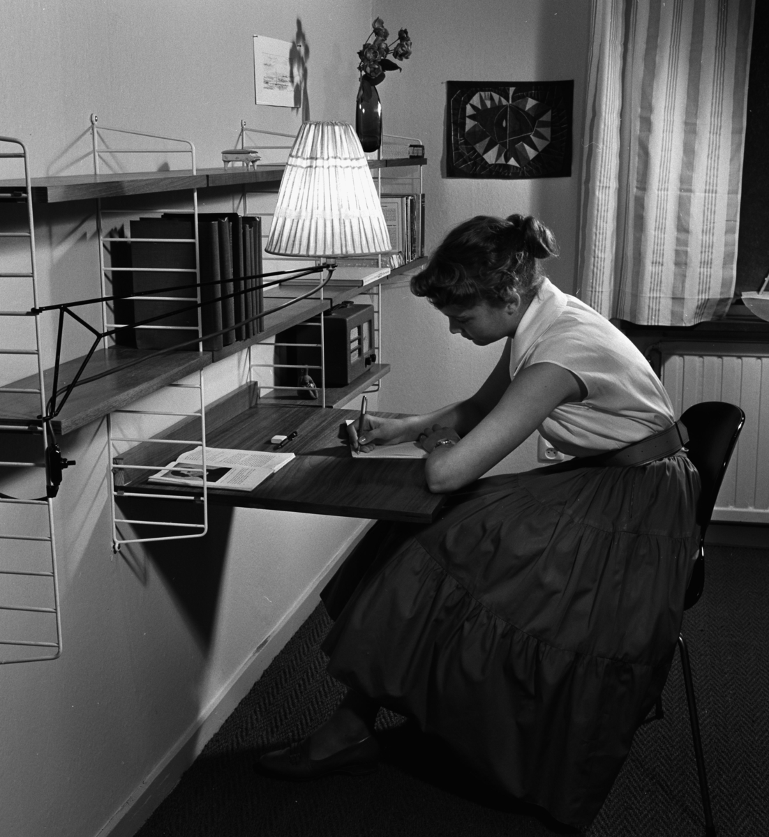 Interiör, kvinna vid skrivskiva i hyllsystem med lampa