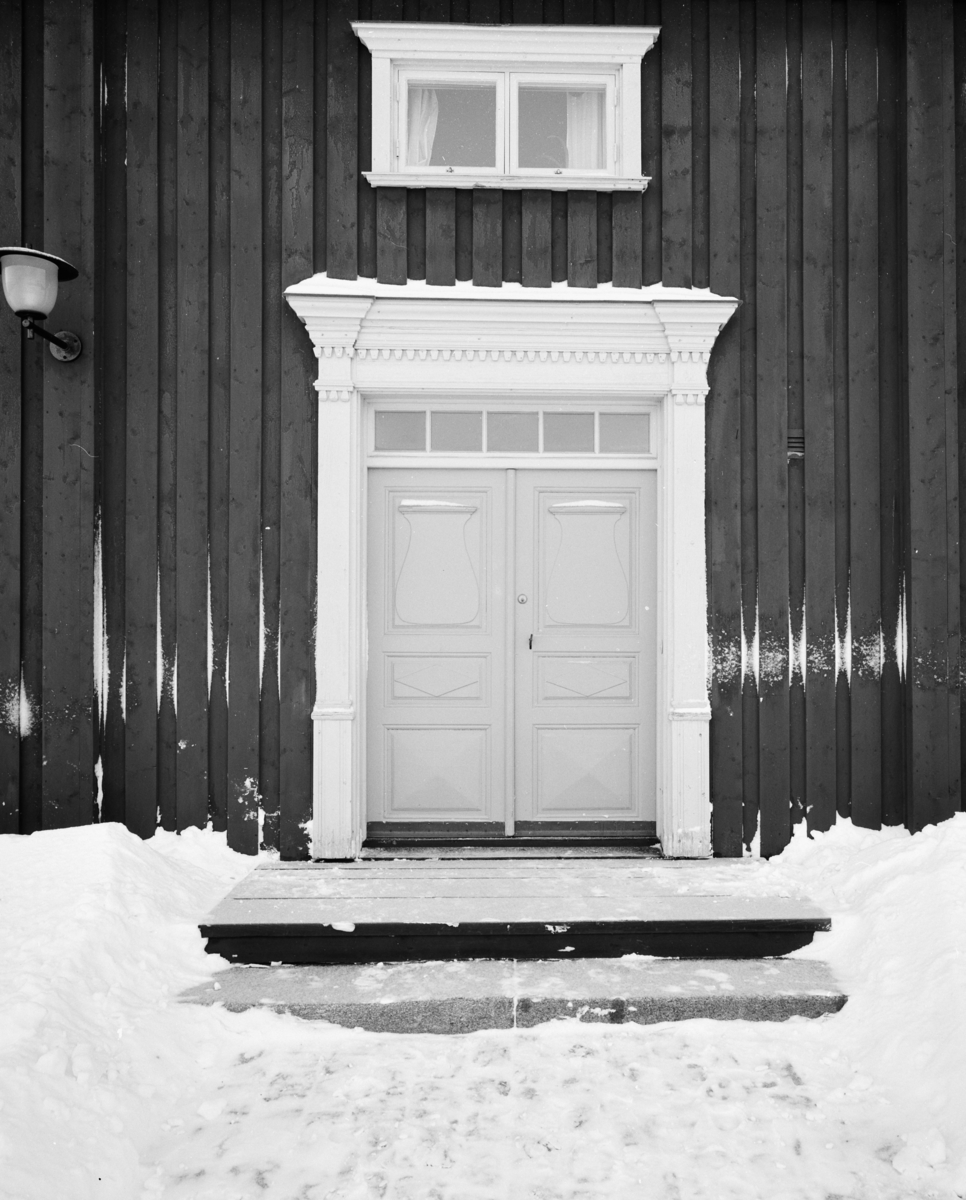 Exteriör, detalj av entrédörr med gamla dörrspeglar