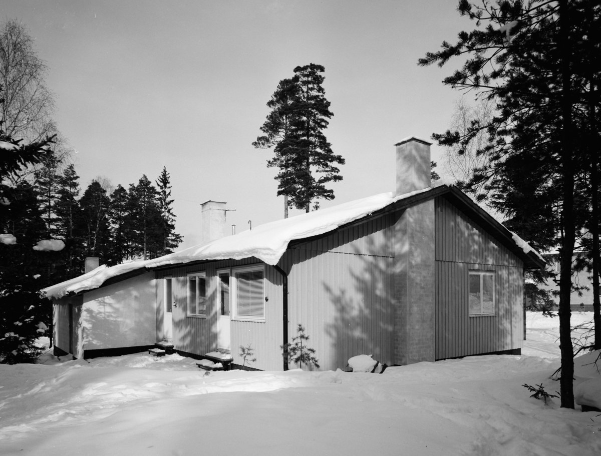 Exteriör, enplanshus vid barrträd i vinterlandskap. Experimenthus