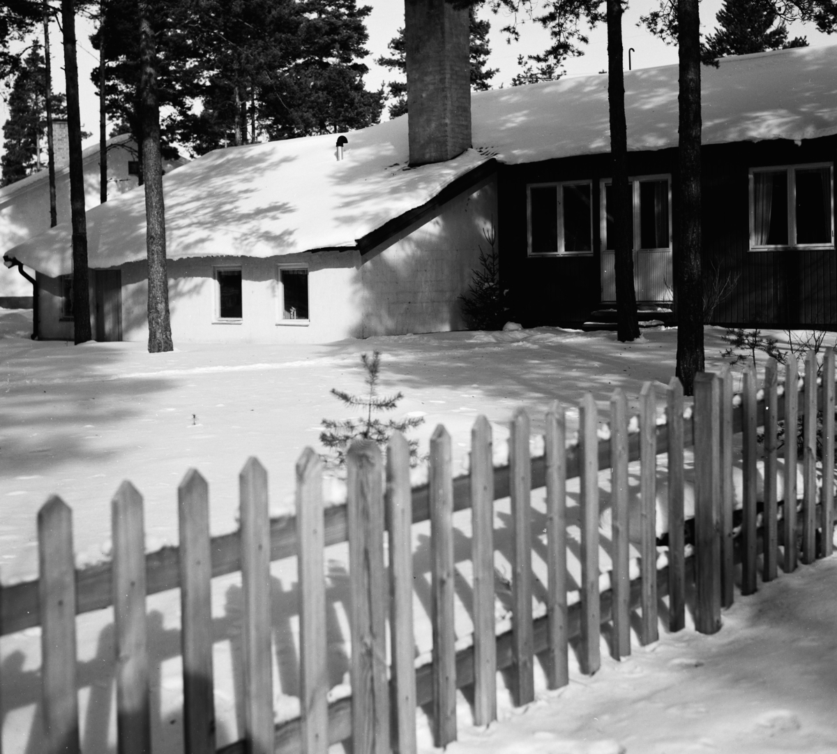 Exteriör, enplanshus beskuggat av höga träd runtom, vinterbild