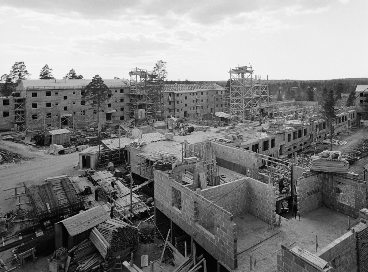 Exteriör, byggarbetsplats i Rågsved, flerbostadshus i fonden