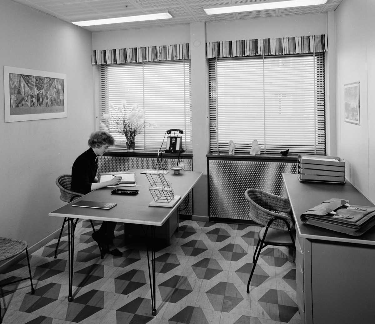 Interiör, kontorsrum med kvinna vid skrivbord.