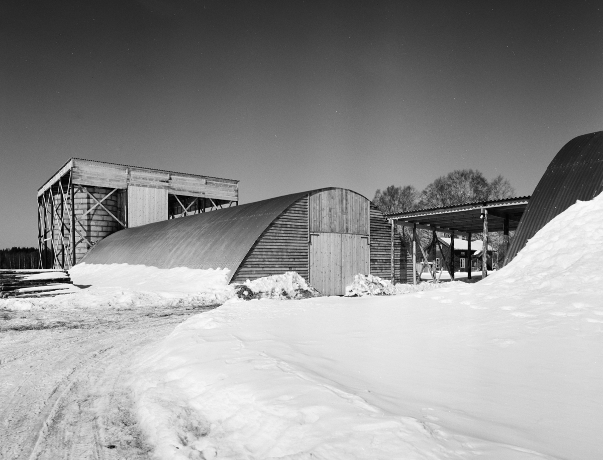 Exteriör, ladugård för biffkor. Byggnad med välvd takkonstruktion, snötäcke i förgrunden