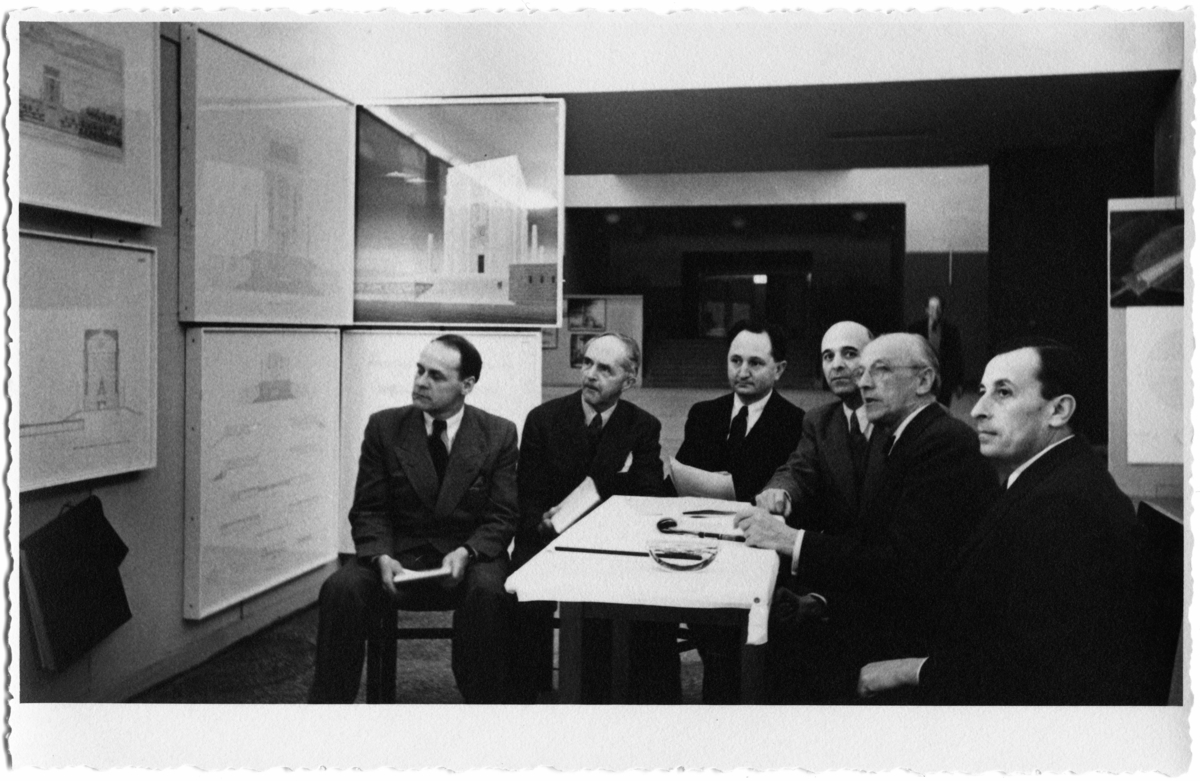 Interiör, sex män som sitter vid ett bord och tittar på ritningar. Ankara 1942