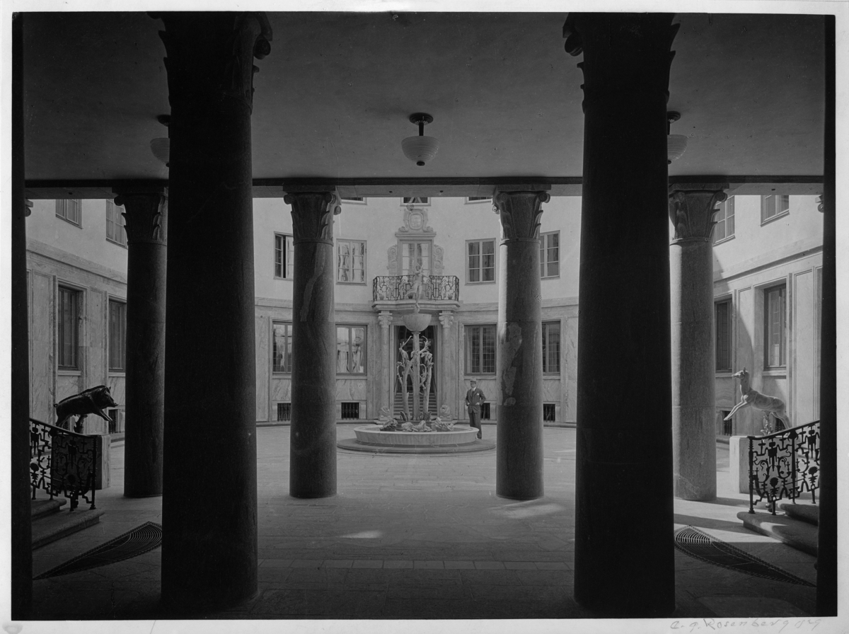 Exteriör, entrégård med statygrupp, arkad med kolonner i förgrunden.
