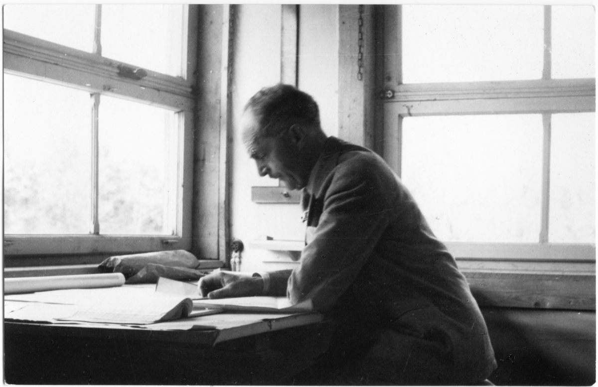 Interiör, porträtt av Ivar Tengbom på byggplatsen.