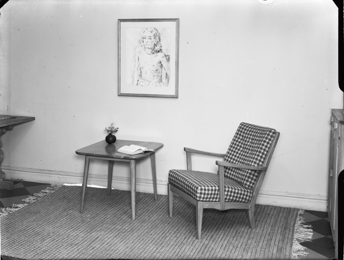 Fåtölj, bord och tavla