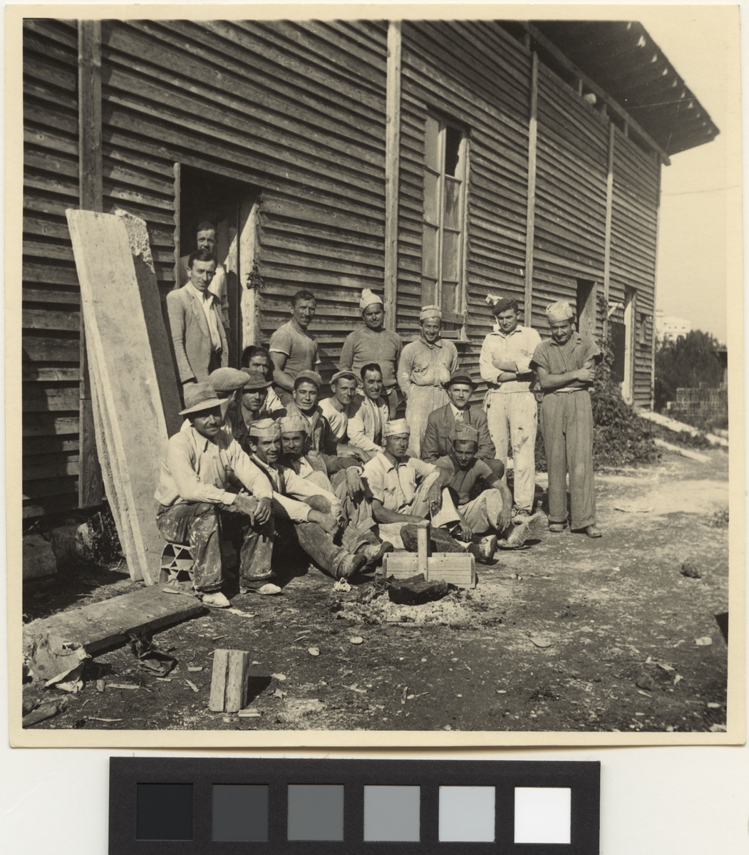 Exteriör. Byggnadsarbetare sittandes i grupp framför en byggnad. I mitten sitter Ivar Tengbom med kostym och hatt.