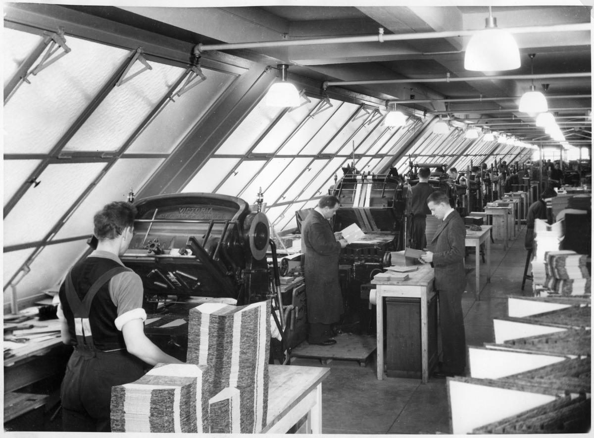 Interiör bokbinderi med förgyllningspressar, snedställda fönster