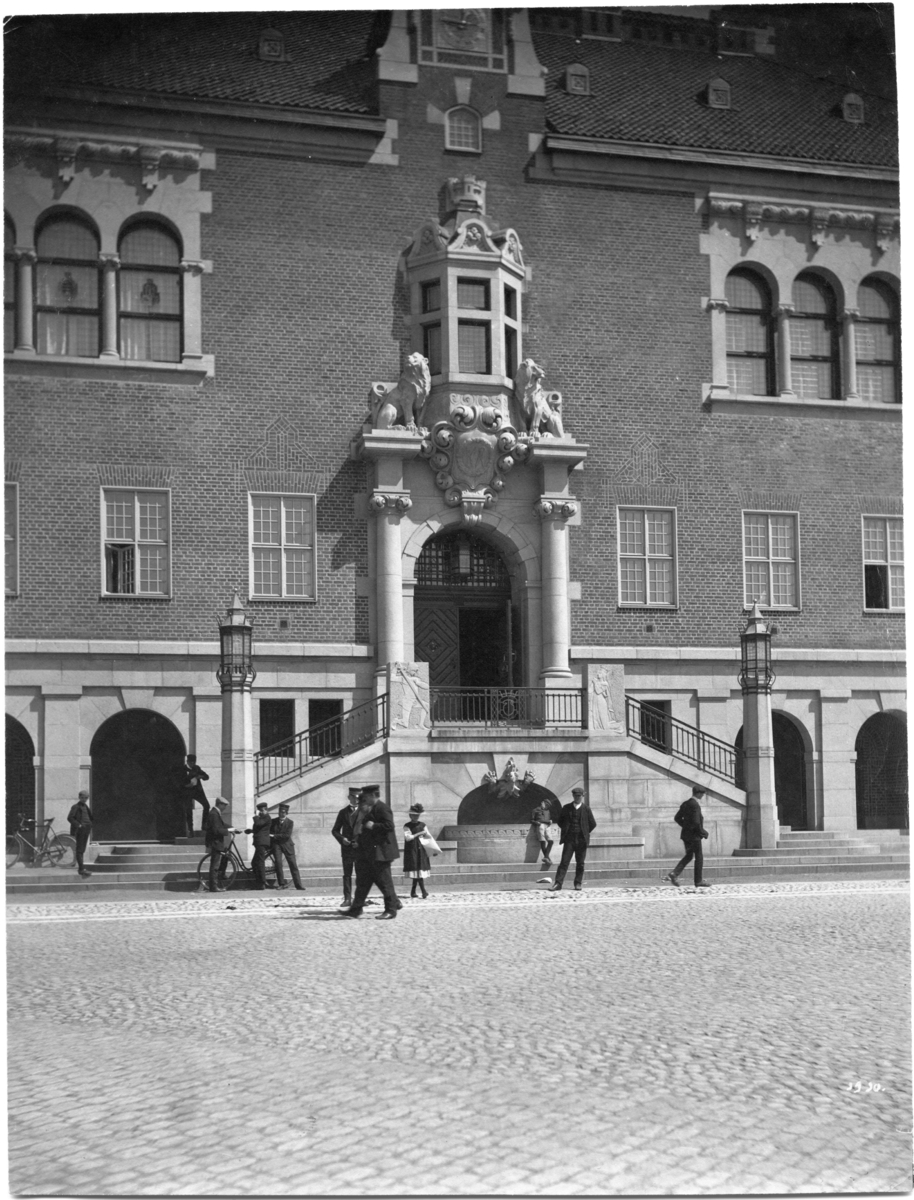Exteriör dagtid. Entré med torg och människor i förgrunden.